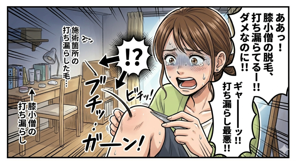 規定回数を超えても膝の毛が明らかに改善されない場合、いくつかの要因が考えられます。まず、打ち漏らしが繰り返し同じ箇所に生じている可能性があります。
