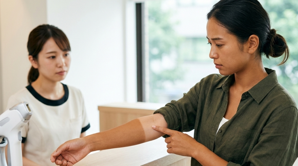 クリニックでは、「肌の色」だけでなく「最近日焼けしたかどうか(問診)」「赤みや炎症がないか(視診)」を合わせて判断します。
